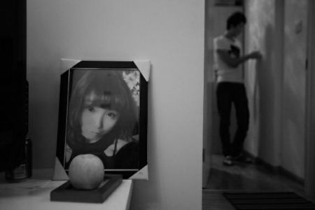 靠墙立着的相框里,是一位漂亮女孩的黑白色照片,水汪汪的大眼睛,嘟着嘴巴,看上去非常可爱,但是,她的眼神中略带一丝丝忧伤。相框前放着一个红红的苹果,热烈的红色,让相框中的女孩显得更加孤寂。