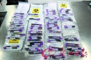 本报深圳讯 (记者崔宁宁 通讯员苏镁怡摄影报道)前日,罗湖海关在一名出境内地女子的随身手提袋中查获96管人体血液样本,初步判断为孕妇血液样本,怀疑是带到香港做相关基因检测用。