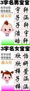 占绝对主流的3字姓名中,男宝宝共53079人,其中第2个字出现频率最高的前5名分别为:“子”2541人、“梓”1874人、“宇”1550人、“浩”1324人、“思”1300人。第3个字出现频率最高的前5名则分别为:“轩”2855人、“辰”2102人、“宇”1847人、“宸”1604人、“涵”1275人。