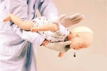 可以采取另外一个姿势,把孩子翻过来,躺在坚硬的地面或床板上,抢救者跪下或立于其足侧,或取坐位,并使患儿骑在抢救者的大腿上,面朝前。抢救者以两手的中指或食指,放在患儿胸廓下和脐上的腹部,快速向上重击压迫,但要很轻柔。重复,直至异物排出。
