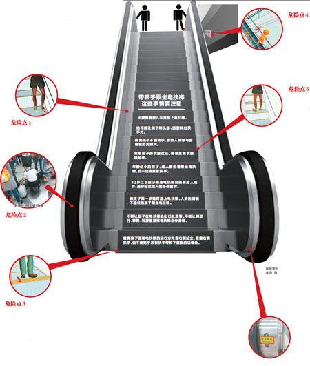 不要让孩子在电扶梯进出口处逗留,不能让其逆行、攀爬、玩耍甚至将电扶梯当作滑梯。
