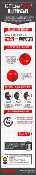 上周,中国青年报社会调查中心通过问卷网对1937人进行的一项在线调查显示,87.8%的受访者发现现在中小学门口仍有很多辣条之类的“三无零食”,87.0%的受访者表示喜欢吃这些“三无零食”的孩子很多,89.8%的受访者对这些零食的安全卫生状况表示担忧。