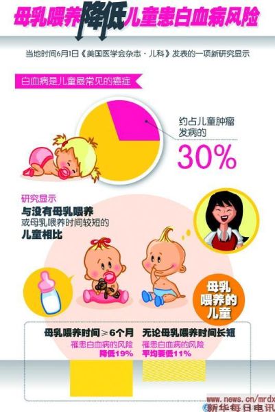 在这项新研究中,以色列海法大学研究人员对1960年以来18项母乳喂养和儿童白血病关系的研究进行了分析,这些研究共包括1万余名白血病患儿和近1.8万名正常儿童。