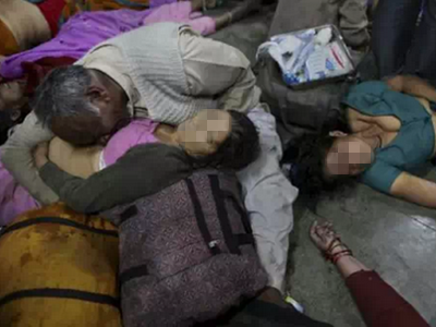 2013年2月10日发生在印度阿拉巴德(Allahabad)踩踏事故的遇难者,丈夫想要保护妻子,但根本无力阻挡人群的力量。这起事件造成36人身亡。图片来自(AP PHOT/Kevin Frayer)