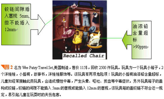 化学性伤害:玩具表面涂料含有毒性,经口鼻进入体内,逐渐累积导致器官受损,产生铅中毒、头痛、头昏、食欲不振等症状。