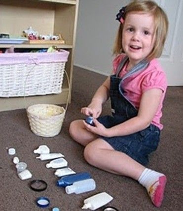 家里不用的小瓶子,小盒子一定很多吧,把它们的瓶盖和瓶身分开, 让孩子们自己去进行配对,很培养孩子的细心观察能力。