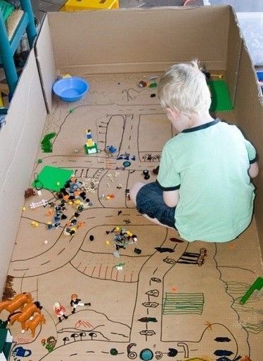 将家里不用的大纸箱取出来,让小朋友自己来绘制一个游戏场,将小脑袋里想像的情景都实现出来,再把乐高小人或者小玩偶都拿来,在自己创造的游戏场里玩情景游戏,充满乐趣。