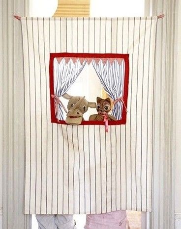找一块床单,diy成一个简单的小幕布,让孩子们带着他们的小手偶来进行绘声绘色的表演吧,要鼓励他们尽情想像来创造吧,其乐融融的家庭亲子时光,多美妙。