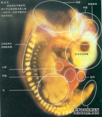 第1个月:胎儿的脑部、眼睛、嘴巴、内耳、消化系统、手、脚开始发育,心脏亦开始跳动。胎儿长约半厘米。