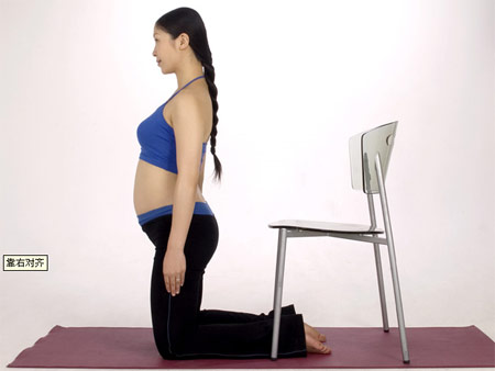 2.两手向后扶椅子。吸气,伸展身体的前侧,扩胸,头向后。