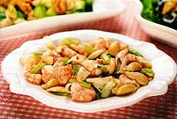 原料:鲜虾仁、西芹、白果仁、杏仁、百合、盐、油、味精等。