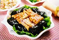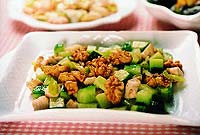 原料:鸡肉100克、核桃仁25克、黄瓜25克、葱姜及各种调味料。
