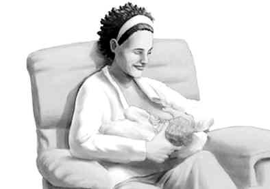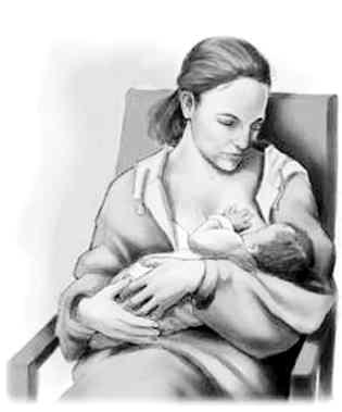 ①在有扶手的椅子上坐直,将孩子抱在怀里,用前臂和手掌托着孩子的身体和头部。喂右侧时用左手托,喂左侧时用右手托。放在乳房下的手呈U形,不要弯腰,也不要探身,而是让孩子贴近你的乳房。这是早期喂奶的理想方式。