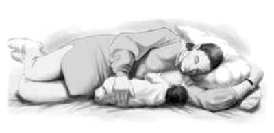 ④疲倦时可躺着喂奶。身体侧卧,让孩子面对你的乳房,用一只手揽着孩子的身体,另一只手将奶头送到孩子嘴里。这种方式适合于早期喂奶,也适合剖腹产的母亲。