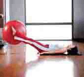 锻炼腹肌、腿肌和韧带。上体平躺,手心向下,放于身体两侧。用两脚夹住球。双腿抬起,直至与地面垂直。双腿慢慢在空中画圈,顺时针和逆时针方向各转12次。