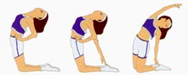 方法:跪地,双手叉腰,吸气身体后弯,保持3—5个呼吸还原。(如果可以把一只手移到脚后跟,尽力使腰向前突出,)(如果可以把左脚移到右脚心。右手向上举起,保持同样呼吸,换另一侧相同。)