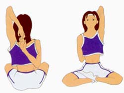方法:简易交叉坐,左臂屈头后,右臂屈背部。左右手相扣,背伸直,保持3—5个呼气。呼气缓慢。换另一侧相同。
