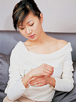 4.用一只手拇指按另一只手侧腕关节4周,按压2~3次后,再做另一侧腕关节。进行上述治疗,部分病人在一个月内症状得到改善。坚持下去会很快痊愈。
