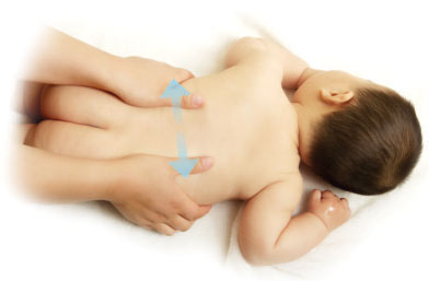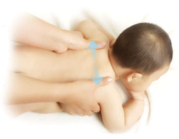 2、五指并拢,掌根到手指成为一个整体,横放在宝宝背部,手背稍微拱起,力度均匀地交替从宝宝脖颈抚至臂部,反复3-4次。