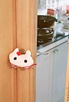 妈咪可以用废旧的布头和棉花做成卡通形状的把手套,套在门把手上,一方面可以降低宝贝头部被碰伤的危险,另一方面起到装饰家居的作用。在门边装上安全门夹,固定门的开关程度,可防止宝贝来回开关门,误伤了手脚。