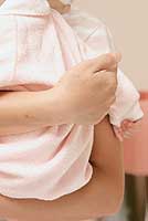 如果宝贝是受凉引起的打嗝,妈咪先抱起宝贝,然后轻轻地拍拍他的小后背,再给喂上一点温热水,给胸脯或小肚子盖上保暖衣被等。
