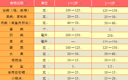 为满足幼儿对能量及营养素的需要,家长有必要为其选择食物,并且要明确吃什么、吃多少、怎么吃。根据儿童生长发育的阶段性及消化吸收特点,每天主副食品种可达30种甚或以上,不同品种的数量与年龄、体重、健康状况等有关,可参见下表。