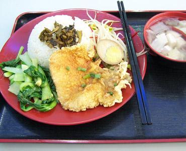 午餐:米饭,蒸玉米,熘肝片配柿子椒,番茄菜花,虾皮紫菜鸡蛋汤。
