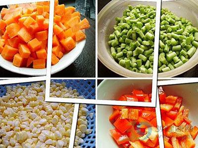 如“炒五丁”:将土豆、胡萝卜、豌豆、香菇、猪肉都切成小丁再炒。