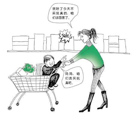 出发前,和孩子预先说好规则:我们现在去超市,你要好好坐在车上,如果你要闹的话,妈妈马上带你回家。一路上,多提醒他几次,进门的时候最后再提醒一遍。刚开始孩子挺好,但没多久就旧态复萌。我重申一遍规则,立刻不买东西,带他出门上车回家,不需要多说。几次之后,孩子果然比较遵守规则。比如有一次,我们去家具店。我要去看地毯,他非要看灯。我蹲下来,看着他的眼睛,很平静地说:“你有两个选择:要么和妈妈一起去看地毯,要么我们现在就回家。”他顿时不响了,我牵着他走,他丝毫没有意见。考虑到孩子还小,我们还通常带点小点心,小贴纸之类的,让孩子在我们买东西的过程中有点事情可做。这也是预防他们哭闹的一个办法,但前提是他们已经懂得要遵守规则。