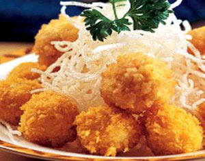 做法:将鲜虾仁加猪肥膘肉一起用刀背砸成泥,加入精盐、绍酒、蛋清、湿淀粉调匀。面包屑装入盘内。把和好的虾泥用手挤成丸子,放在面包屑的盘中,蘸上一层面包屑。勺内放入油,烧至五成热时,把虾球放入油中,炸成金黄色捞出,装在盘内即成。