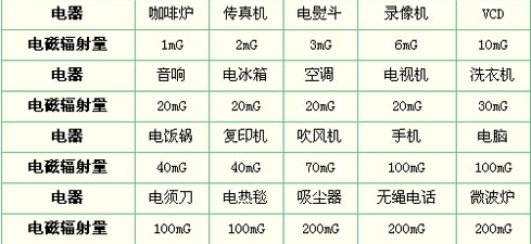 关于具体的辐射量,记者在努力搜寻一番之后,并未发现国内有不同电器辐射量的标准表格出台。不过,日本出版的SAPIO杂志就公布了一组家庭常用电器电磁辐射检测数据。