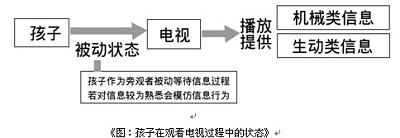 其次,由于孩子在观看电视过程中,一直处于期盼下一个镜头的状态中,孩子没有时间对采集到的信息进行能动的分析,也就只能处在被抑制状态中被动的接受了。因此其逻辑思维的延伸性无法得到有效实现。