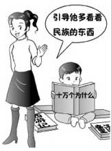 一位妈妈介绍经验时说:“我的儿子今年7岁,他6岁的时候就已经认识1 600多个字了,平时除了看儿童版的《西游记》、《三国演义》和童话书以外,还看《十万个为什么》和其他一些简单的小儿书。我没有强迫儿子看什么不看什么,只是引导他多看看民族的东西,少看些没有精神实质的动画片。除此之外,我非常注意利用街上各种各样的广告牌、商店招牌、单位名牌等帮助儿子识字,其实有很多字都是通过这种方法在街上认识的。”