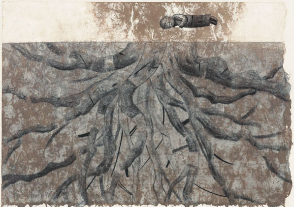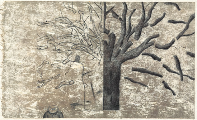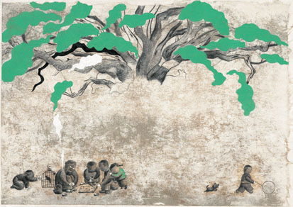 家树,一个象征家族兴盛的掠影。以大树为主体,用一种创新形式,描绘家树的历史。图画借鉴了古前壁画的朴拙稚趣笔法,呈现出一种原始的历史厚度。画面色调光影淡出淡入、明暗对比的节奏变化,契合一种复甦与再生的生命发展自然规律。在时间推移上,高明的借用了摄影师的表现技法,使读者面前的大树,不再是一个静置的物画,而是赋予了动感和生机的大树