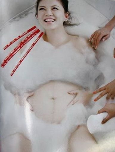 李湘怀孕时,也给某时尚杂志拍了大肚沐浴照。李湘躺在浴缸中,关键部位都被浴液泡泡遮住,裸出大肚,开心大笑。