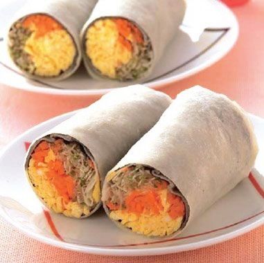 材 料:春卷皮1张 紫菜1片 苜蓿芽30克 胡萝卜40克 鸡蛋1个