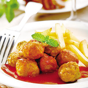 3. 取一个圆盘,放入烤好的肉丸,配上薯条,舀入适量番茄沙司即可。
