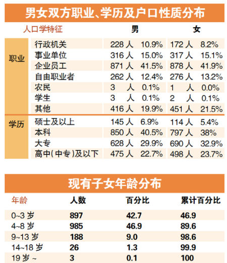 与人们的印象相符,申请二孩的主力军是80后。调查显示,男、女双方各2099人,其中,男方平均年龄为34.16岁,90 %以上集中于31~40岁阶段,21~30岁者占人口总数的19.49 %,31~40 岁者占人口总数的 72.27 %。