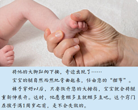 有时当您正打算给宝宝穿连身衣或裤子,他却将两条小腿使劲绷得直直的,让裤子怎么也套不上,好像故意和您作对似的。