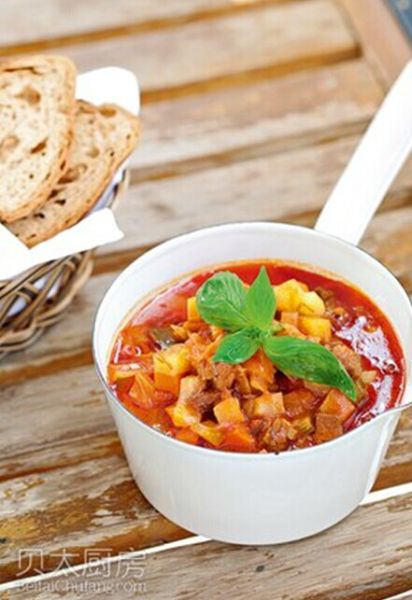 1. 原料 (煮牛腩的辅料除外):牛腩肉150g、大番茄100g、圆白菜100g、土豆100g、洋葱50g、芹菜50g、胡萝卜100g、白胡椒粒5g、酸奶油5g、香叶2片、番茄酱20g、盐5g、白胡椒粉5g、糖40g、黄油50g