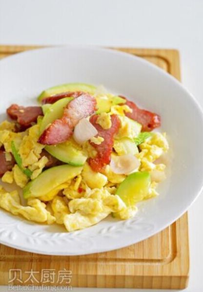 5. 加入叉烧肉片和鸡蛋翻炒至角瓜成熟即可。