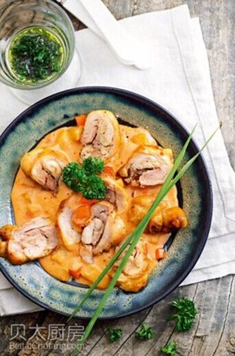 4. 烤完后把鸡肉卷捞出盛放在盘子里。接着制作咖喱酱汁,把烤盘里的蔬菜再次倒入平底锅内,加椰汁(150ml)、鸡汤(150ml)、肉桂粉、柠檬叶大火煮开,加入马沙文咖喱酱(可以在进口食品超市或网上购得),转小火熬煮并且不停地搅拌,直到咖喱酱完全融化,关火准备装盘。