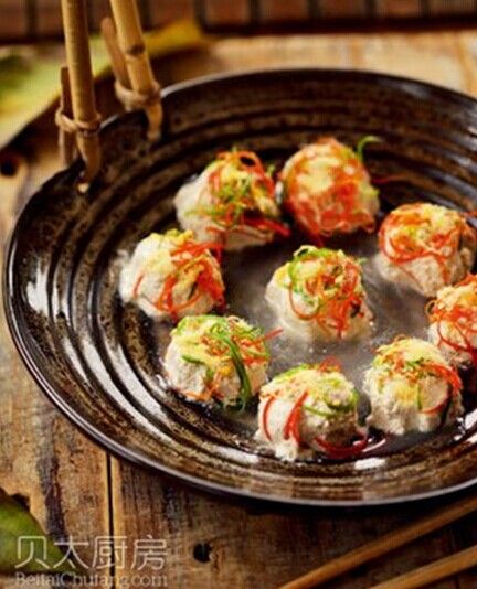 这是乐山西坝豆腐的一道代表名菜。传说以前做这道菜的厨娘在相中一位客官的时候,呈上的这道菜豆腐上就会点缀上丰富的色彩,如果对食客无意,端上的豆腐就是单调的白色,用菜肴来传情达意,豆腐球如同绣球,故此得名。