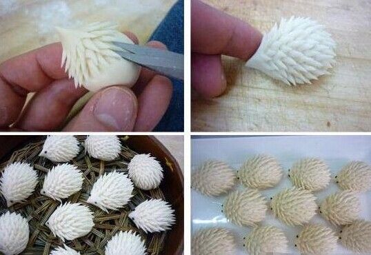 所有原料放在一起揉成面团。醒发半小时,搓条下成小剂子,包入花生馅,搓成象刺猬一头尖的形状。
