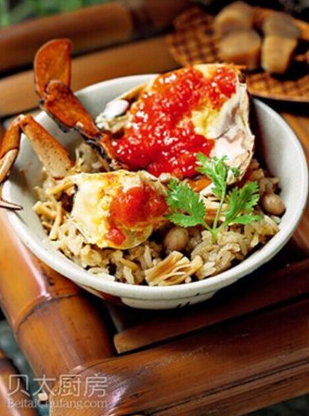 3. 红鲟(即肉蟹)洗净,从第三、第四足之间插入一细铁钎,横向贯穿蟹身,待其停止运动,抽出铁钳,掀开蟹盖,去除蟹鳃、蟹脐,将蟹身切成大块,蟹钳拍破放在糯米饭上盖上蟹盖。