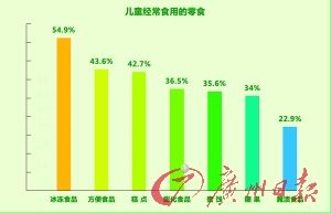 6%的儿童每天食用方便面,9%的儿童每天食用薯片,每天食用蜜饯和奶茶的儿童比例为10%,11%的儿童每天食用火腿肠和果冻,每天食用口香糖和饼干的儿童比例为15%,在夏天,每天食用冰淇淋的儿童更是高达26%。