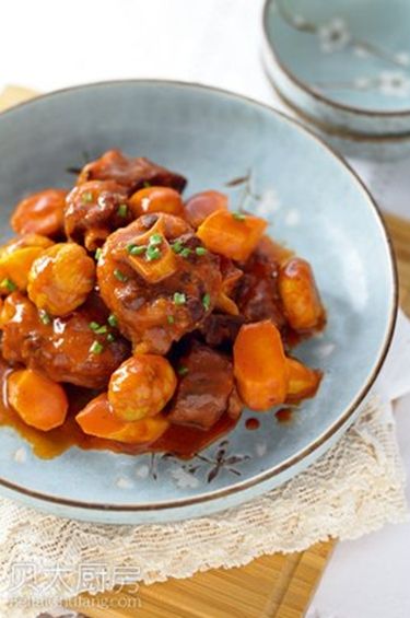 1. 牛尾沿骨节剁成小段,放入滚水中汆烫1分钟,捞出,沥干水分。