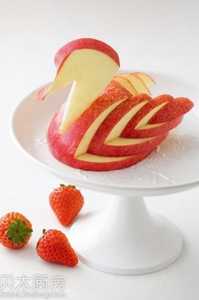 4. 把苹果片排开做天鹅的翅膀。苹果中间切掉宽0.5厘米左右的小槽,用来放天鹅的头部。
