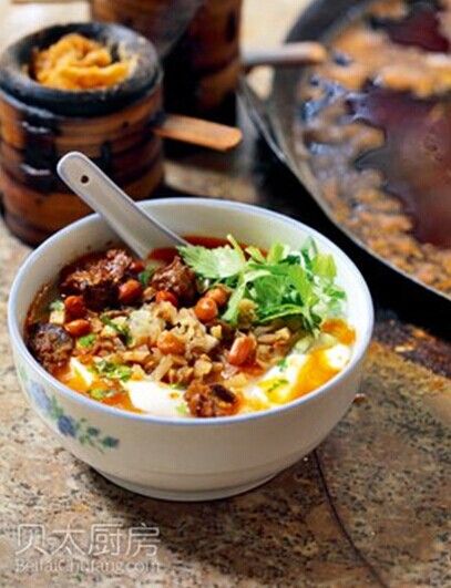 5. 将豆花、勾了芡的鸡汤盛入碗中,加入粉条,浇上牛肉浇头,调入酱油、红油辣椒、花椒粉,最后加上炸花生米、大头菜碎,撒上水芹菜即可。
