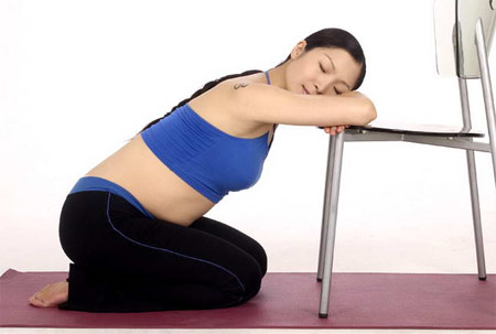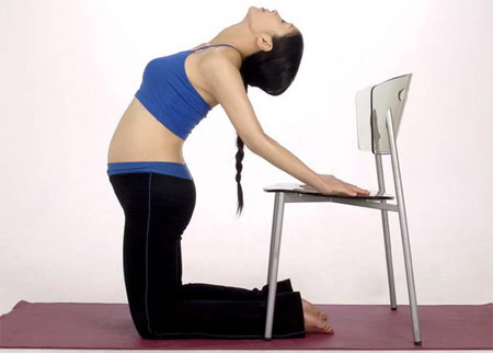 2.两手向后扶椅子。吸气,伸展身体的前侧,扩胸,头向后。